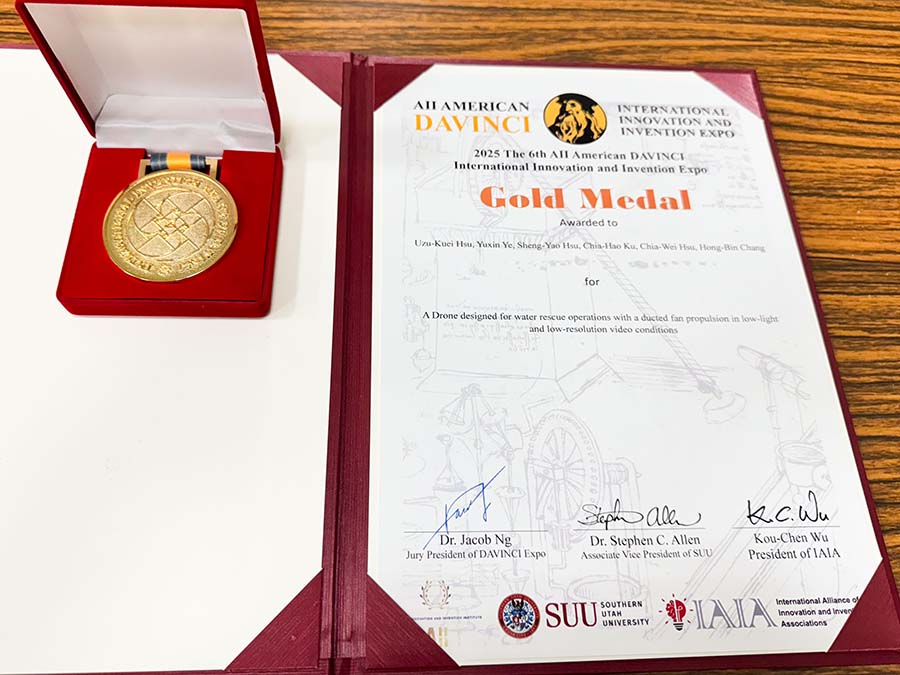 The team recently participated in the 2025 AII American DAVINCI International Invention Exhibition (hosted by Southern Utah University) and won a Gold Medal for their work. The UAV was selected from nearly 200 entries from 14 countries, including the United States, Taiwan, Hong Kong, Canada, Thailand, Morocco, Australia, Peru, and Ecuador.