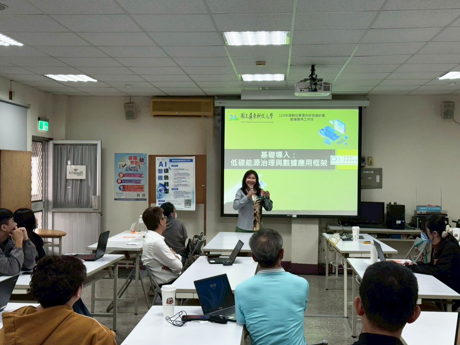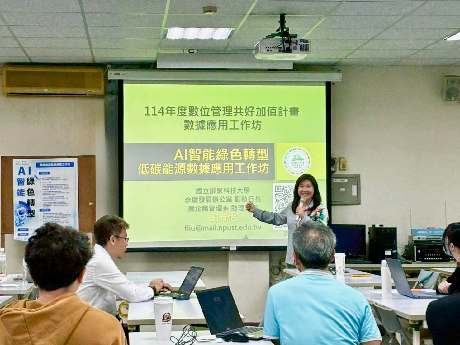 The project was directed by Dr. Fangyi Liu, who is also the Deputy Executive Officer of NPUST’s Sustainable Development Office and an Assistant Professor at the Department of Agribusiness Management. As part of the promotional work, the team hosted the “AI Green Transformation Low-Carbon Energy Data Application Workshop” at the Qianzhen Technology Industrial Park (KTIP) in Kaohsiung. The workshop was held in two sessions on October 29 and November 4 (2025), respectively, bringing together over 20 enterprises from Southern Taiwan’s energy, metal, and electronics manufacturing sectors. Together they worked to jointly establish a collaborative industry-academia model for the “AI Green Transformation”.