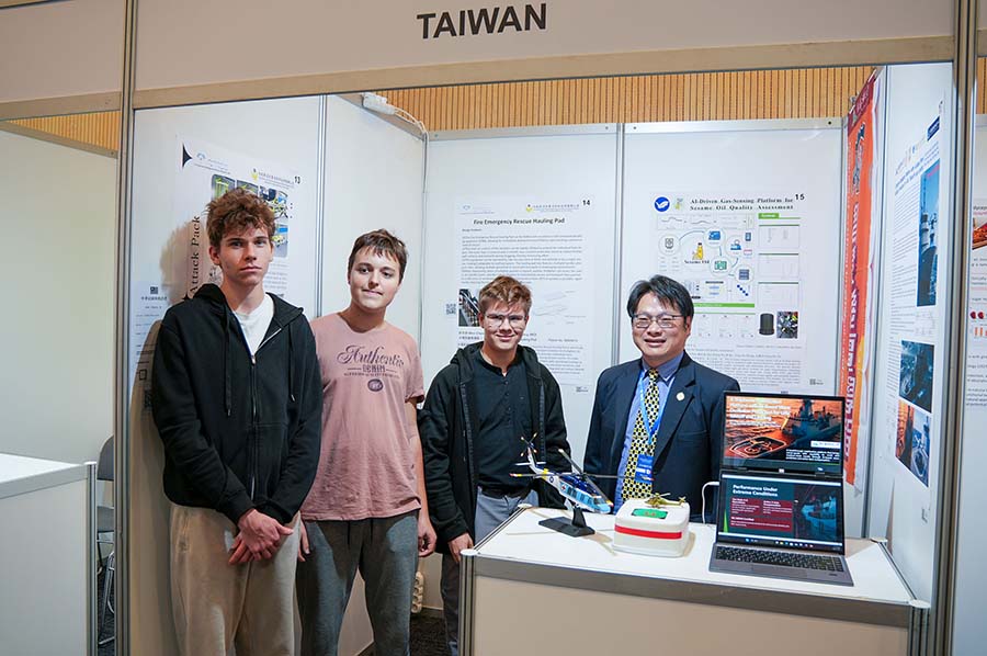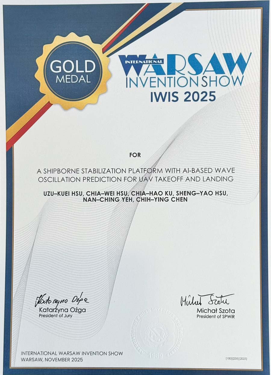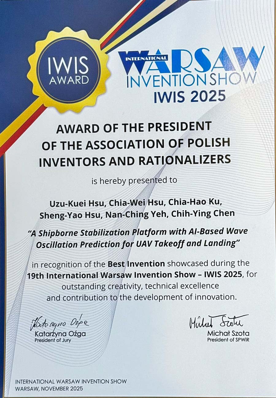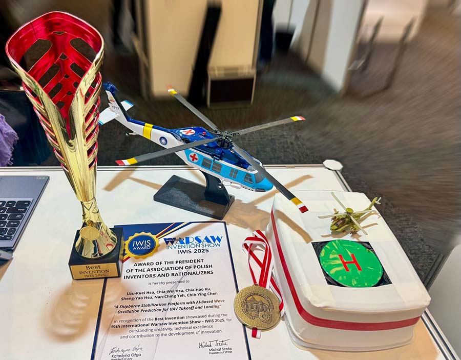 Among Taiwan’s participants, a collaborative group headed up by National Pingtung University of Science and Technology (NPUST) performed exceptionally well for their invention which was entitled “Shipborne Stabilization Platform with Al-Based Wave Oscillation Prediction for UAV Takeoff and Landing”. Their sophisticated contribution secured them the Gold Medal and the Best Invention Award for outstanding creativity and technical excellence by the organizing committee. The invention, which was developed by a team led by Professor Hudson Hsu of the NPUST Smart Mechatronics Bachelor Degree Program, in cooperation with the Navy, Air Force, and Academia Sinica, successfully addresses dangers associated with drone take-off and landing on small and medium-sized ships in rough seas.