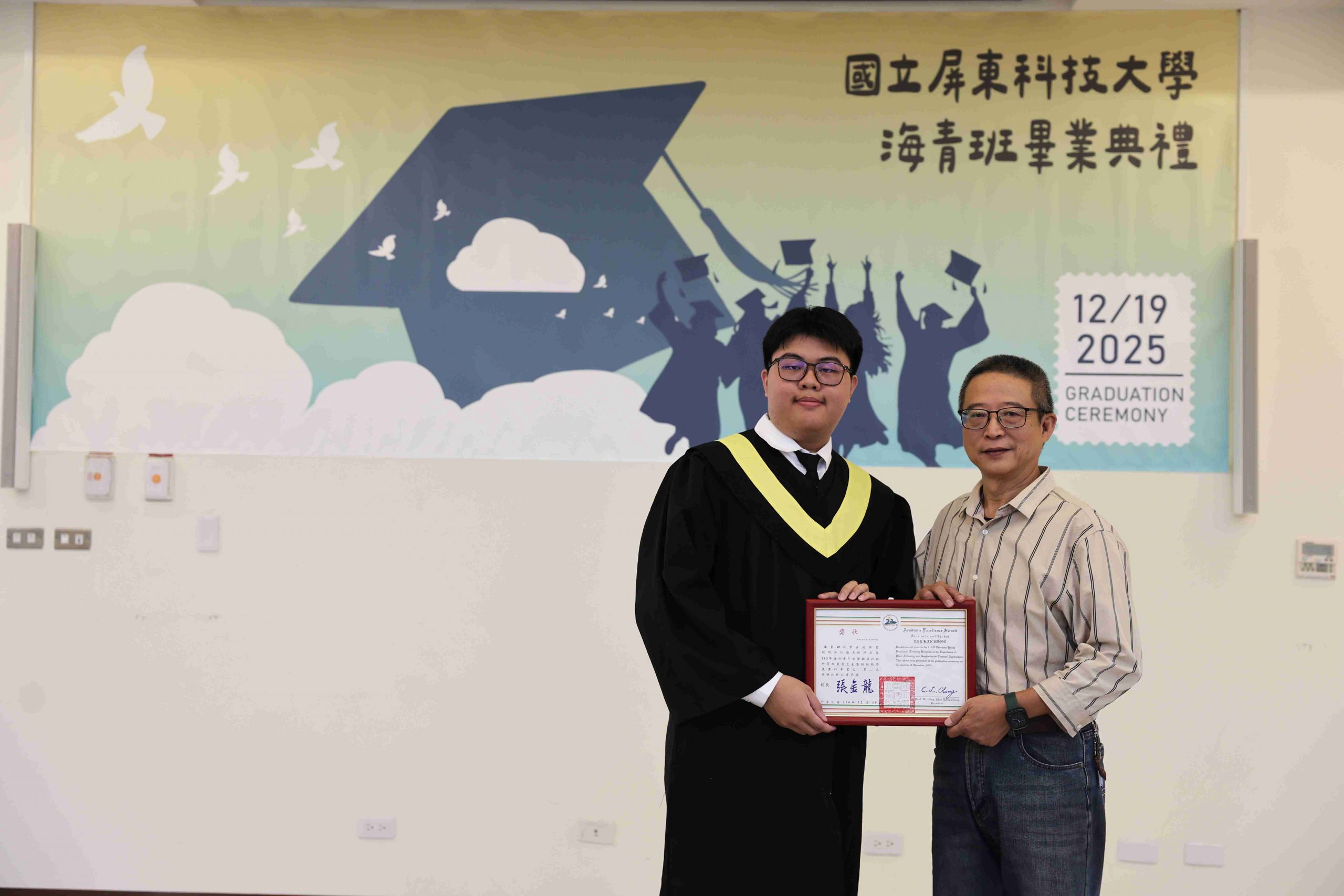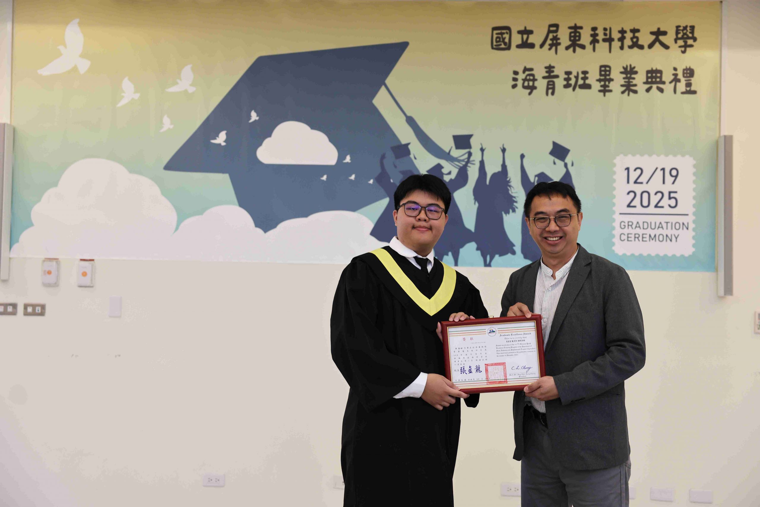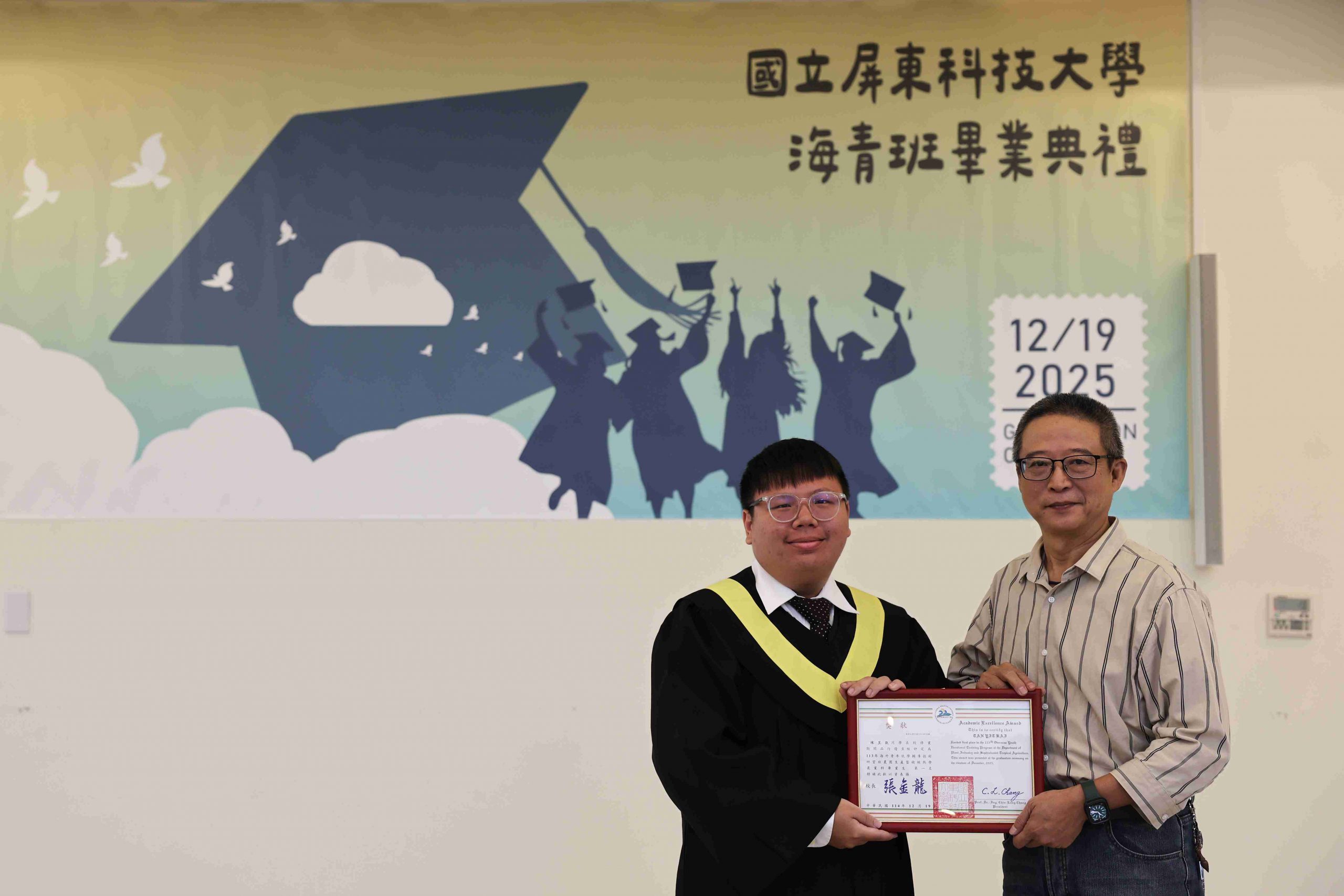 The Taiwan Overseas Community Affairs Council (OCAC) regularly organizes the Overseas Youth Vocational Training Program to promote Taiwan’s high-quality vocational education and provide overseas Chinese youth with opportunities to acquire professional skills. National Pingtung University of Science and Technology (NPUST) arranged a Department of Plant Industry – Tropical Agriculture and Horticulture Program in the previous academic year to help these students master various techniques related to refined tropical agricultural production. On the morning of December 19th, a graduation ceremony was held for the students at the NPUST Big Data Center. Approximately 40 attendees, including graduates, parents, faculty, and current students, gathered to witness the occasion and support the students as they prepare to move to a new stage in life.