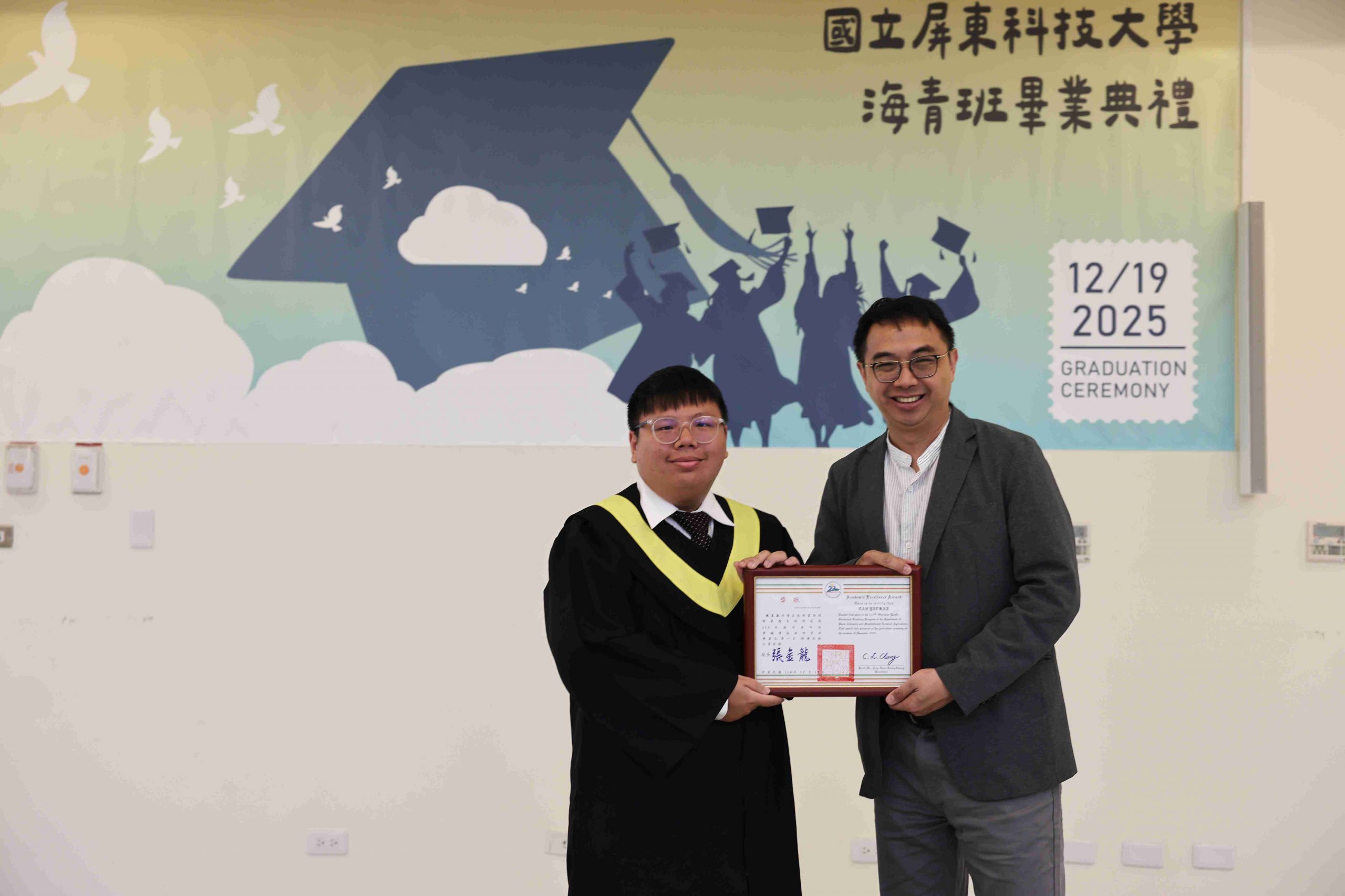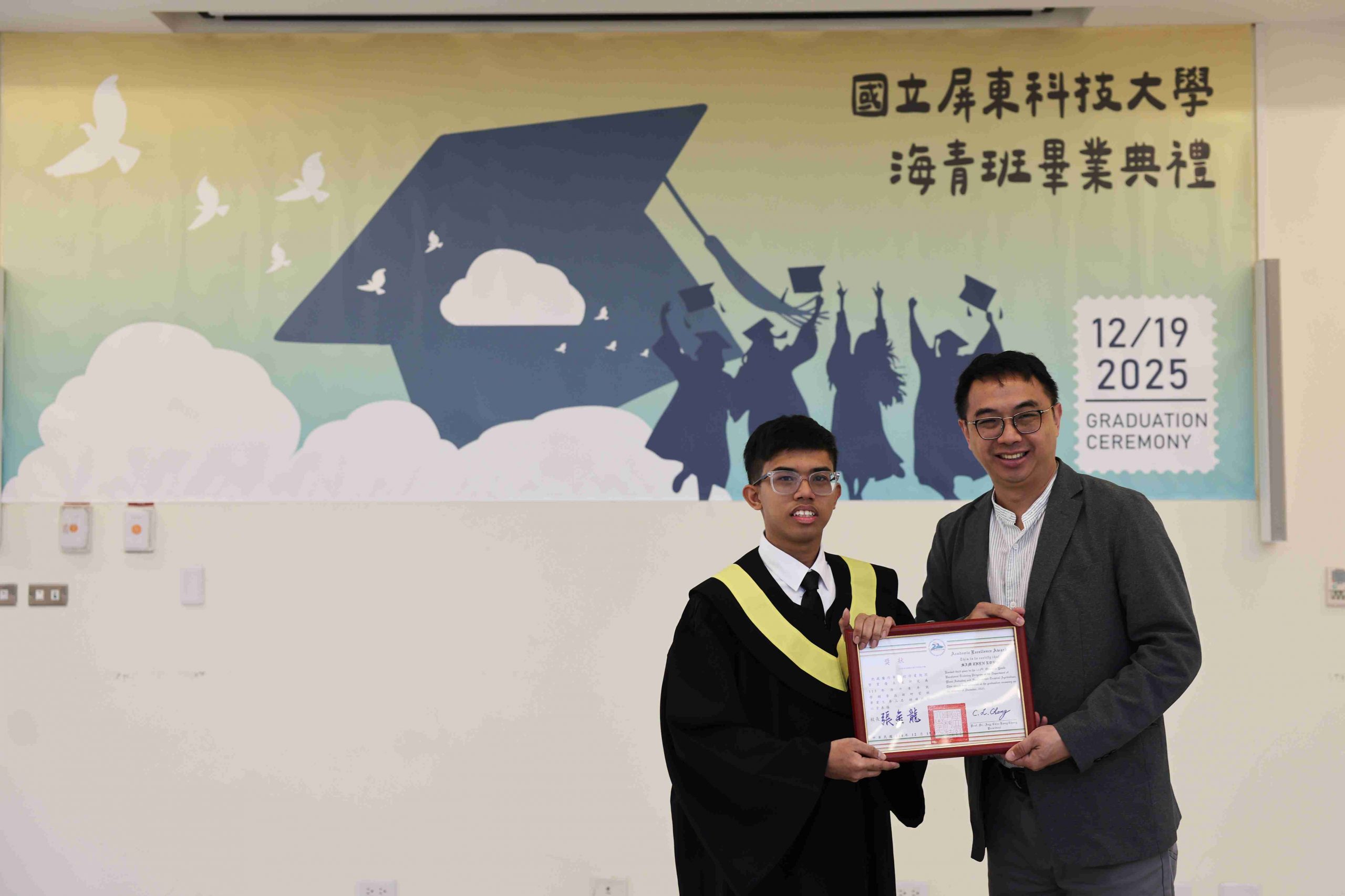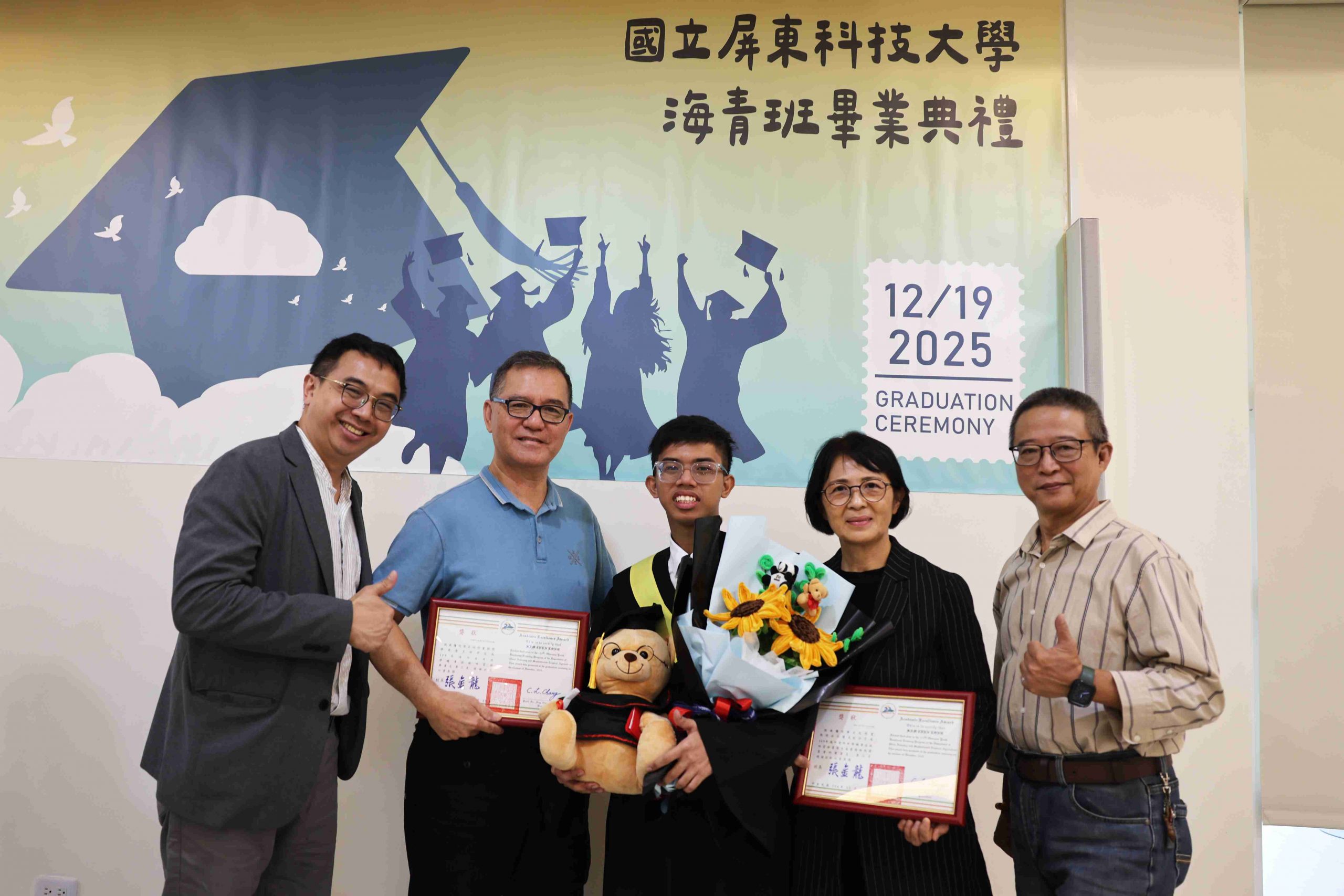 Dean Ru-Chu Shih personally presented the graduation certificates, and Director Yu-Shen Liang and Assistant Professor Wei-Chen Chen presented awards for Academic Excellence and Outstanding Conduct. Representing the graduates, Tan Yit Kai delivered a speech expressing gratitude for the teachers’ guidance and the companionship of his peers—also sharing his growth and achievements during his time in Taiwan. Representing the current students, Lam The Khang offered sincere blessings and the continuation of friendship as the torch was passed to the next class of students.