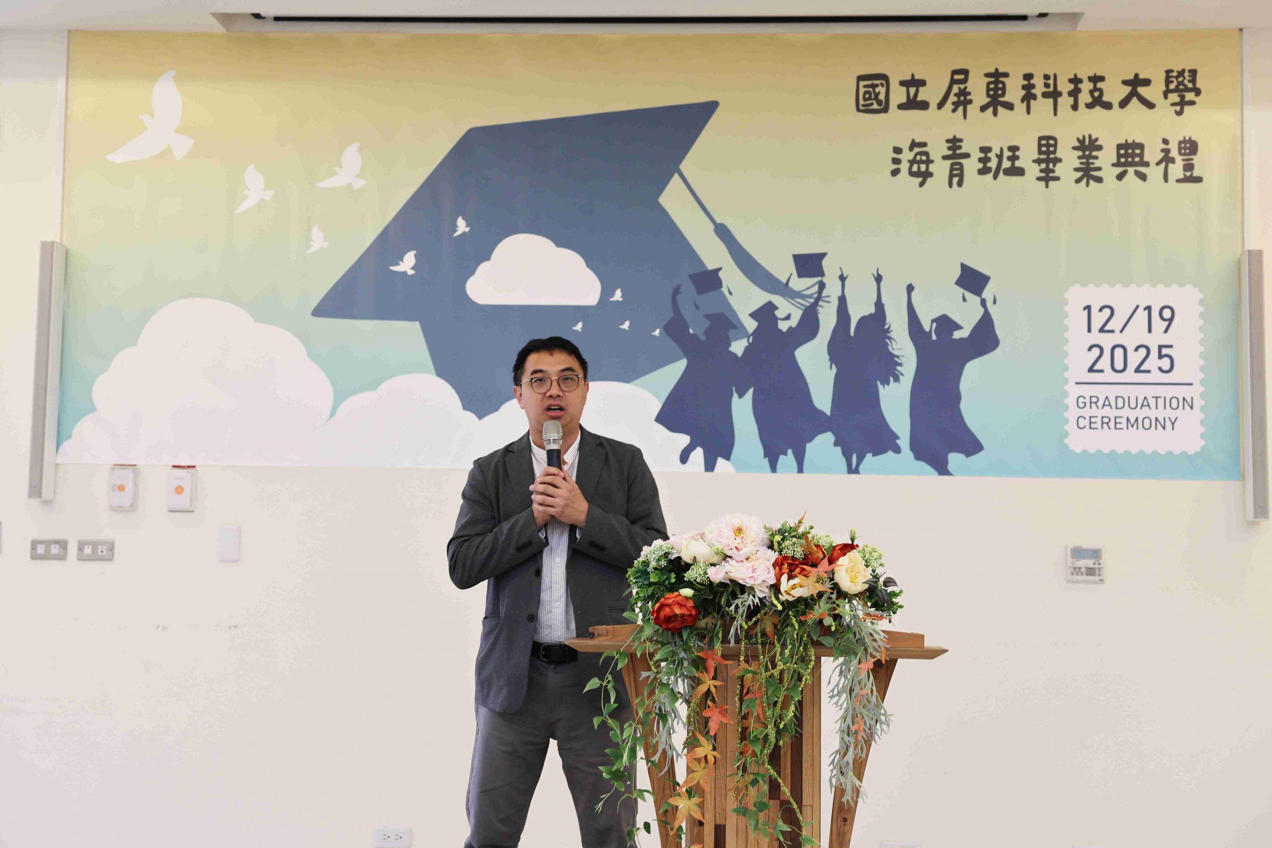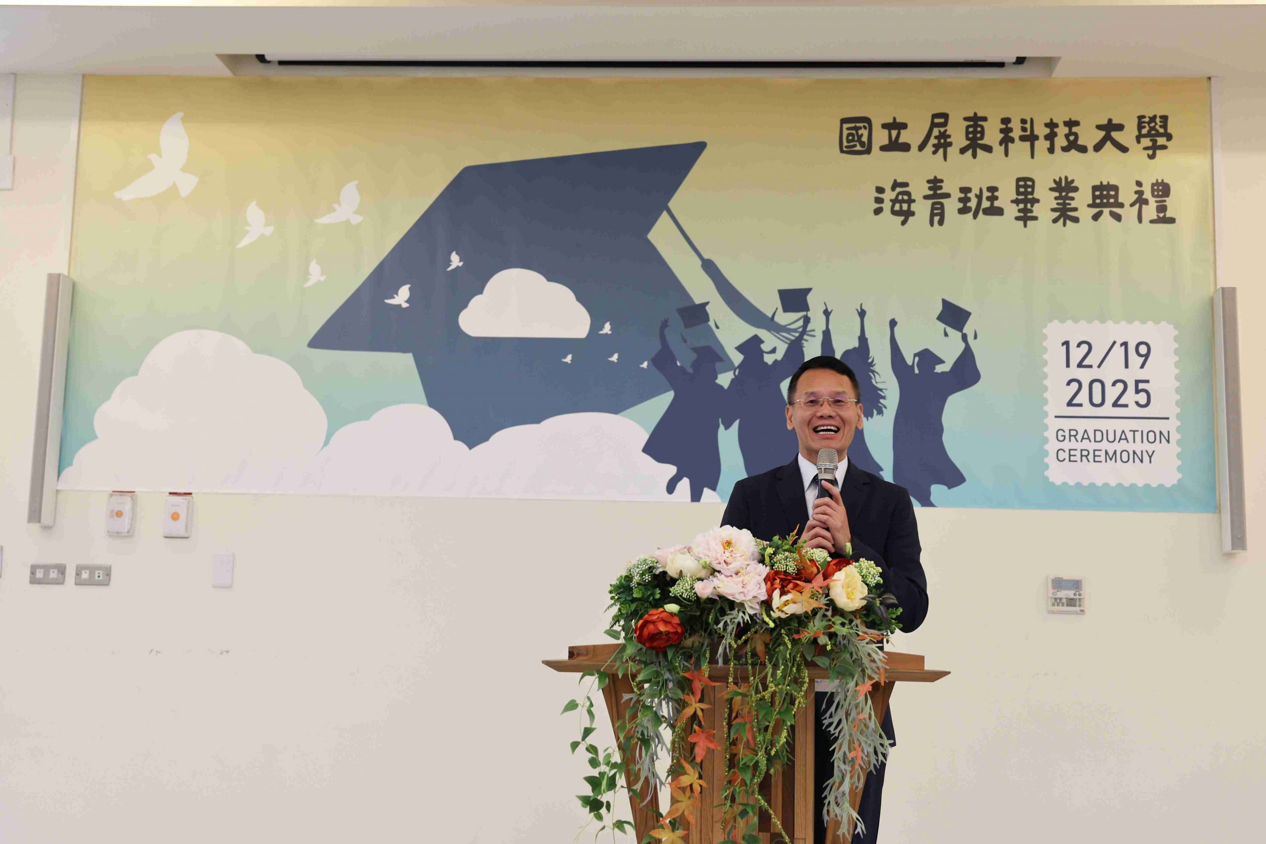 The ceremony opened with a retrospective video showcasing the graduates’ academic journey and daily life in Taiwan, evoking fond memories for everyone present. Following the video, the graduates entered the hall to enthusiastic applause. Dr. Ru-Chu Shih, Dean of the Office of International Affairs, delivered an address praising the students for their perseverance and hard work while studying away from home. He encouraged the graduates to continue honing their professional skills and to apply the things they’ve learned in Taiwan to their future careers and lives. Dr. Yu-Shen Liang, Director of the Department of Plant Industry, also encouraged the graduates to maintain their passion for learning and to keep a grounded attitude while bravely facing future challenges.