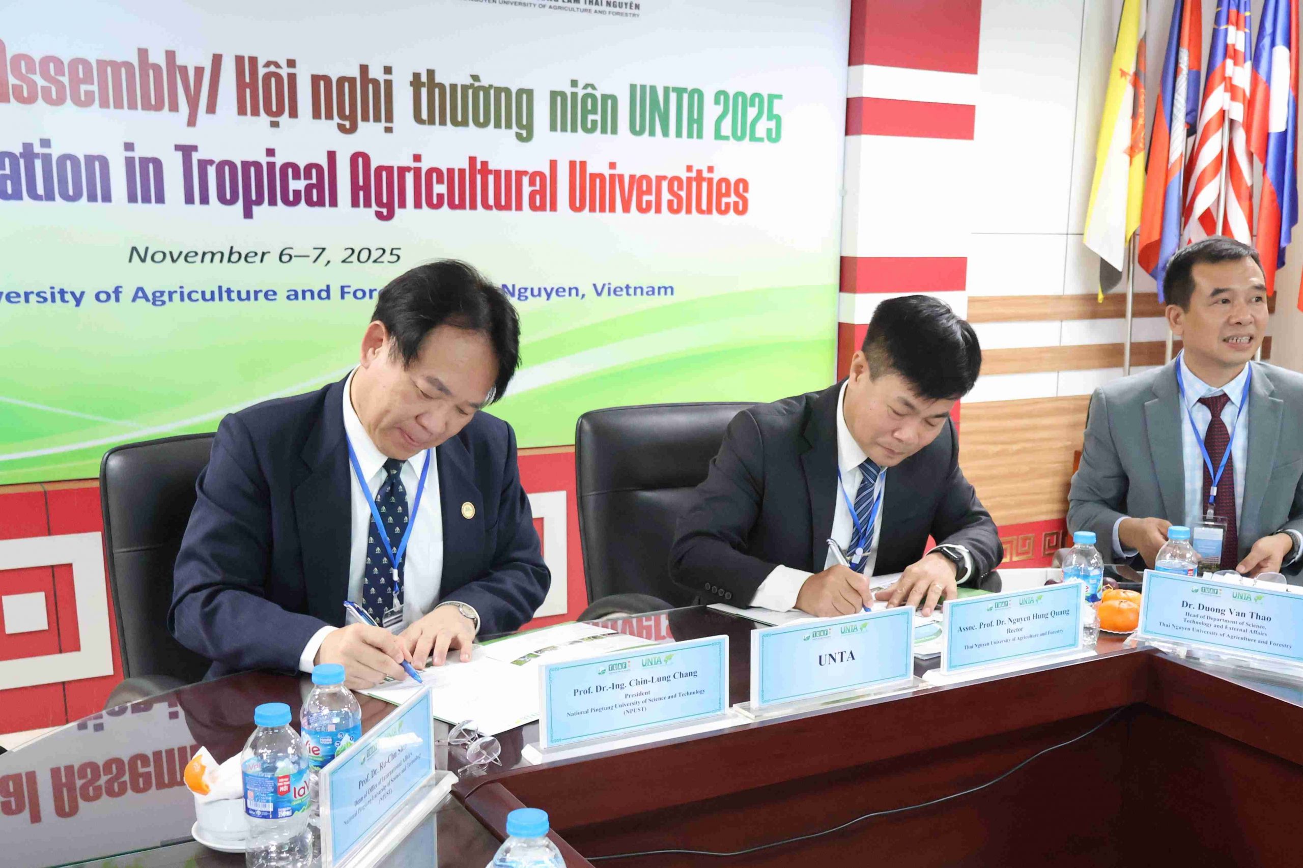 From November 6th to 7th, President Chang and Dean Ru-Chu Shih attended the 2025 UNTA Annual Meeting and the 6th National Conference on Animal and Veterinary Sciences. NPUST serves as the Permanent Secretariat of the University Network for Tropical Agriculture (UNTA), assisting in the coordination and promotion of annual cooperation. This year’s meeting was hosted by TUAF under the theme “Green Transformation in Tropical Agricultural Universities,” bringing together member representatives from Vietnam, Thailand, Indonesia, India, Malaysia, Guam (USA), and Taiwan in both physical and virtual formats.