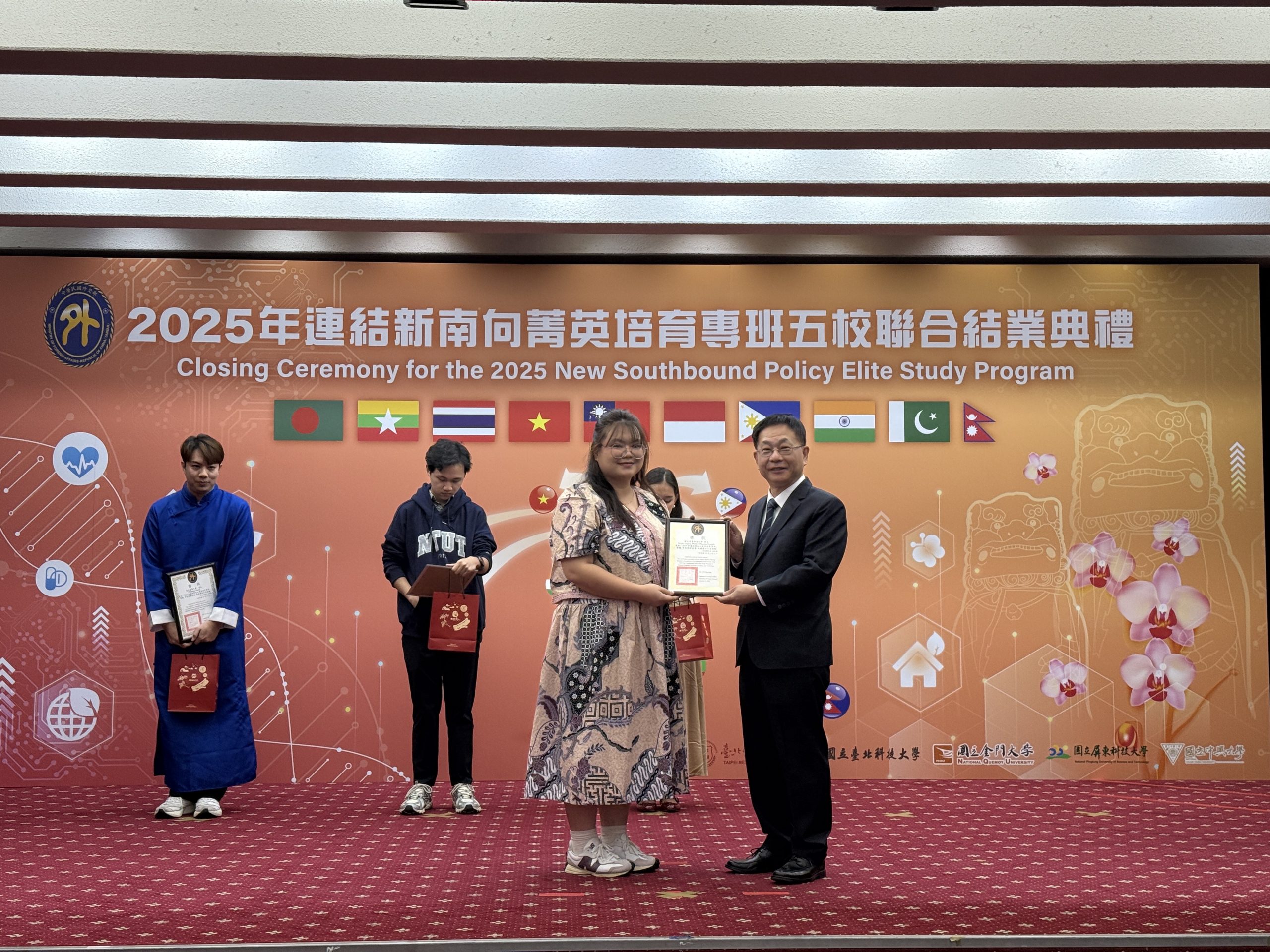National Pingtung University of Science and Technology (NPUST) was invited to the Ministry of Foreign Affairs (MOFA) Auditorium to attend the joint graduation ceremony for the New Southbound Policy Elite Study Program on January 12th (2026) together with four other universities. The ceremony was presided over by Baushuan Ger, the Vice Minister of Foreign Affairs, who presented the “Minister’s Award” on behalf of Foreign Minister Lin Chia-lung to outstanding students from the five partner universities, recognizing their exceptional performances and learning achievements throughout the program.