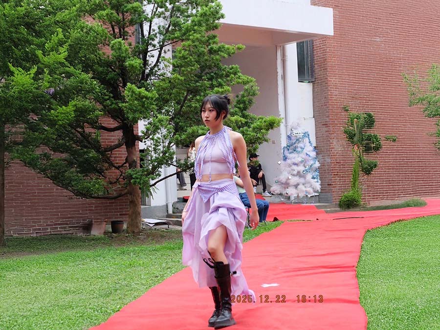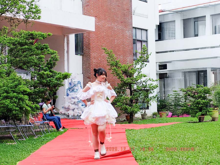 The dynamic exhibition took place on the afternoon of December 22 at the Department of Fashion Design and Management courtyard. Students walked a red-carpet runway to present works from several key courses, including Garment Construction (Instructor: Chao-Jung Lai), Poise and Etiquette (Instructor: Hsien-Yin Wen), and Development and Application of Fashion Materials (Instructor: Shu-Fang Huang)